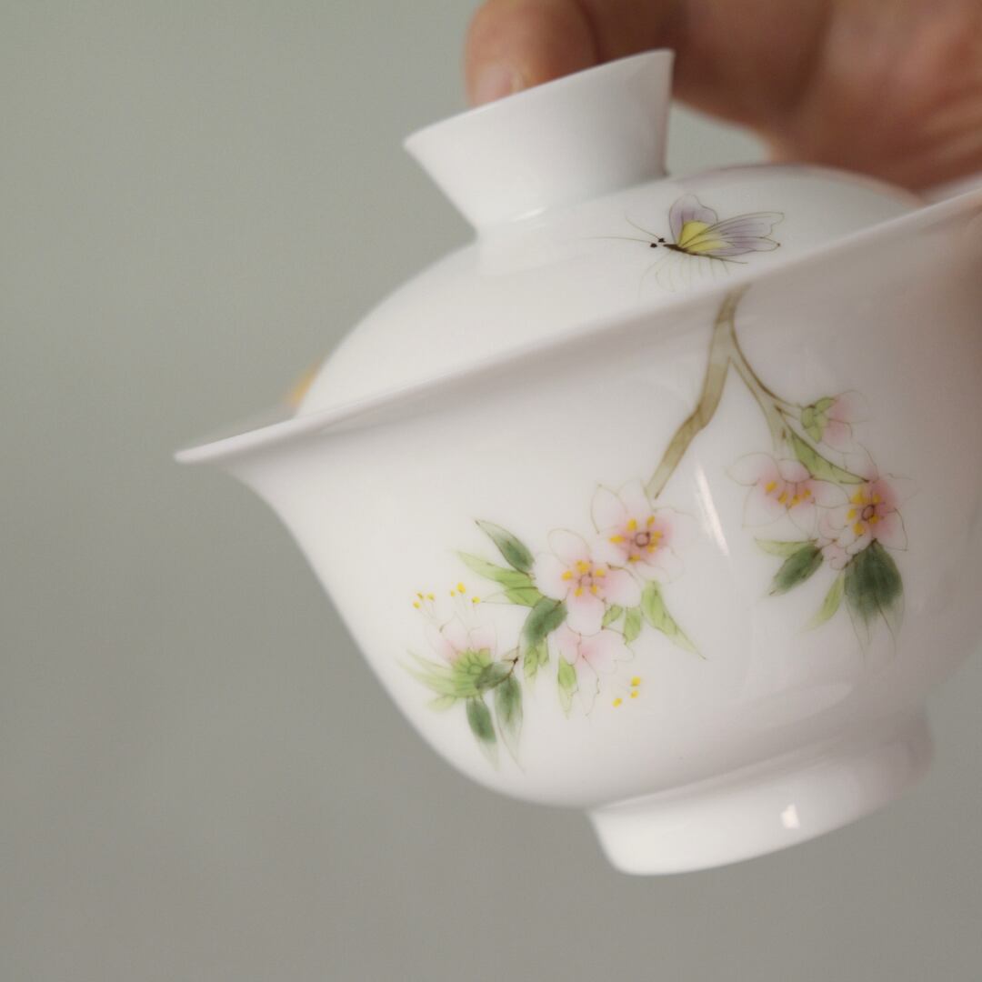 滑らかな手触りが魅力の白磁に、手描きで桃の木が描かれた蓋碗です。桃の木は古くから「長寿」や「吉祥」の象徴とされ縁起のよいモチーフとして愛されてきました。