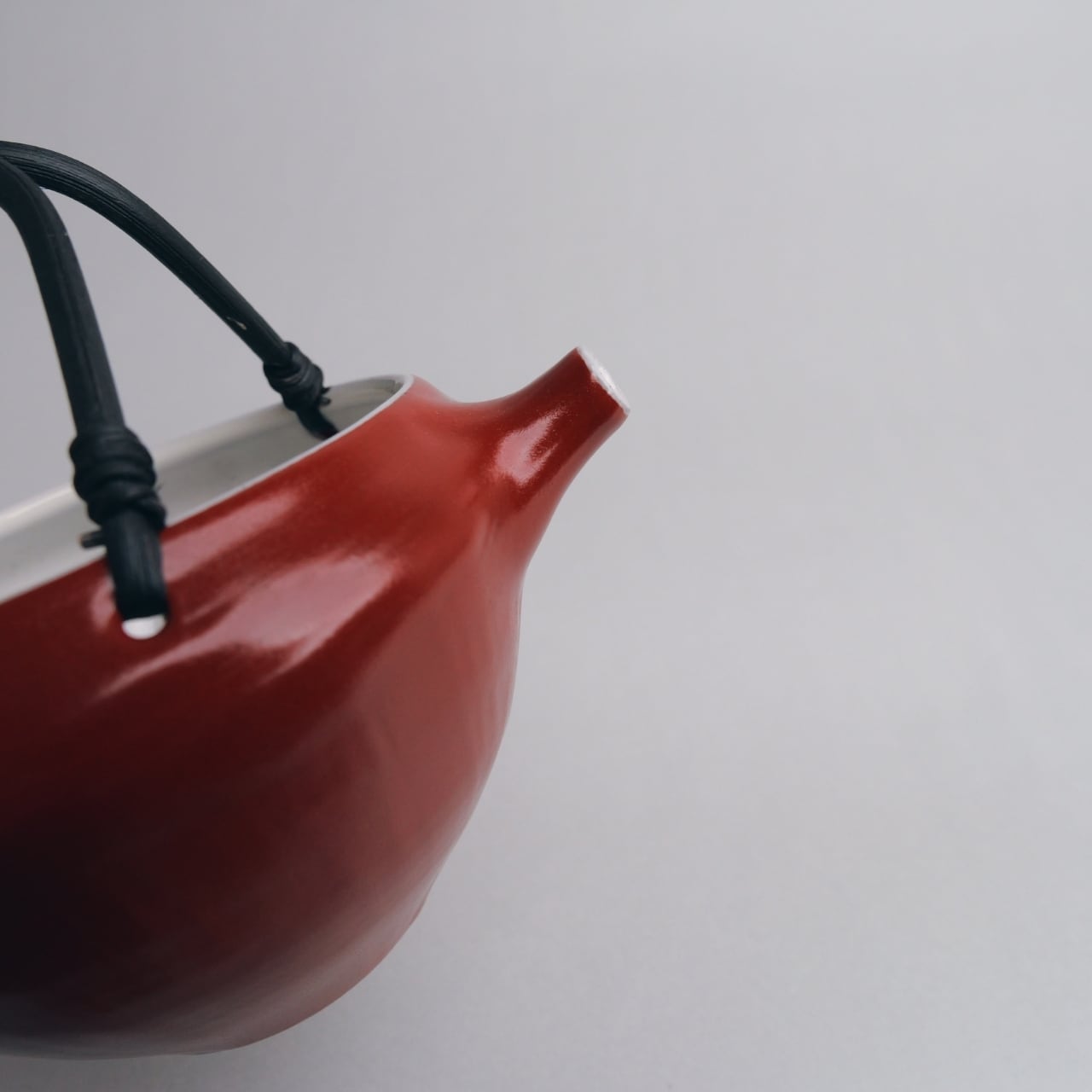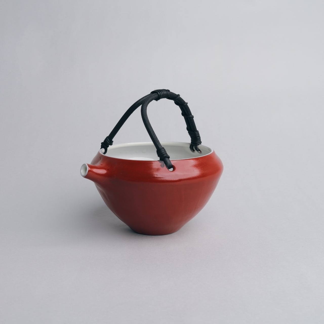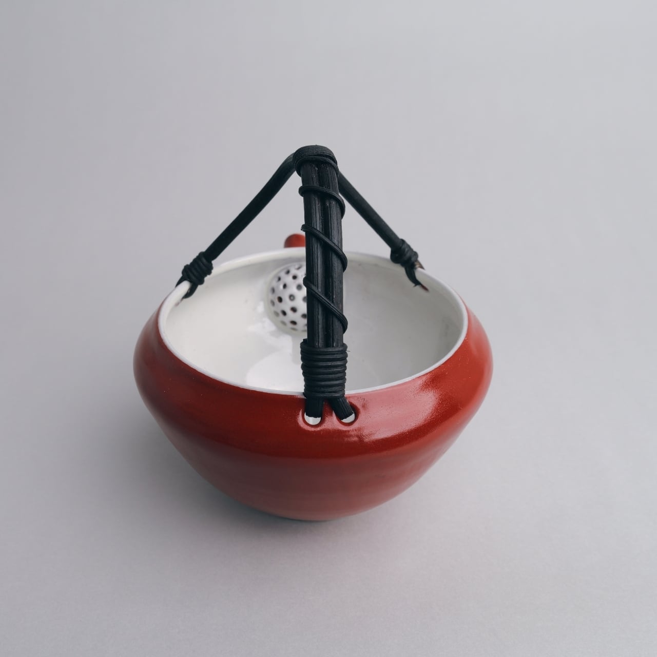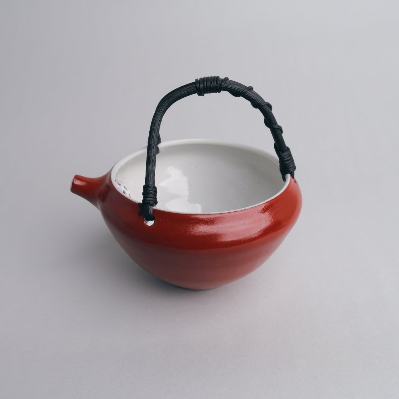 抜け感を添えてくれる茶海けん茶壷。持ち手の部分は藤を細く割き、ひとつひとつ手作業で編み上げる伝統的な技法、藤編みをあしらったとても現代的な茶器です