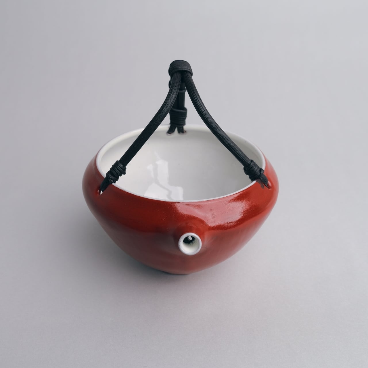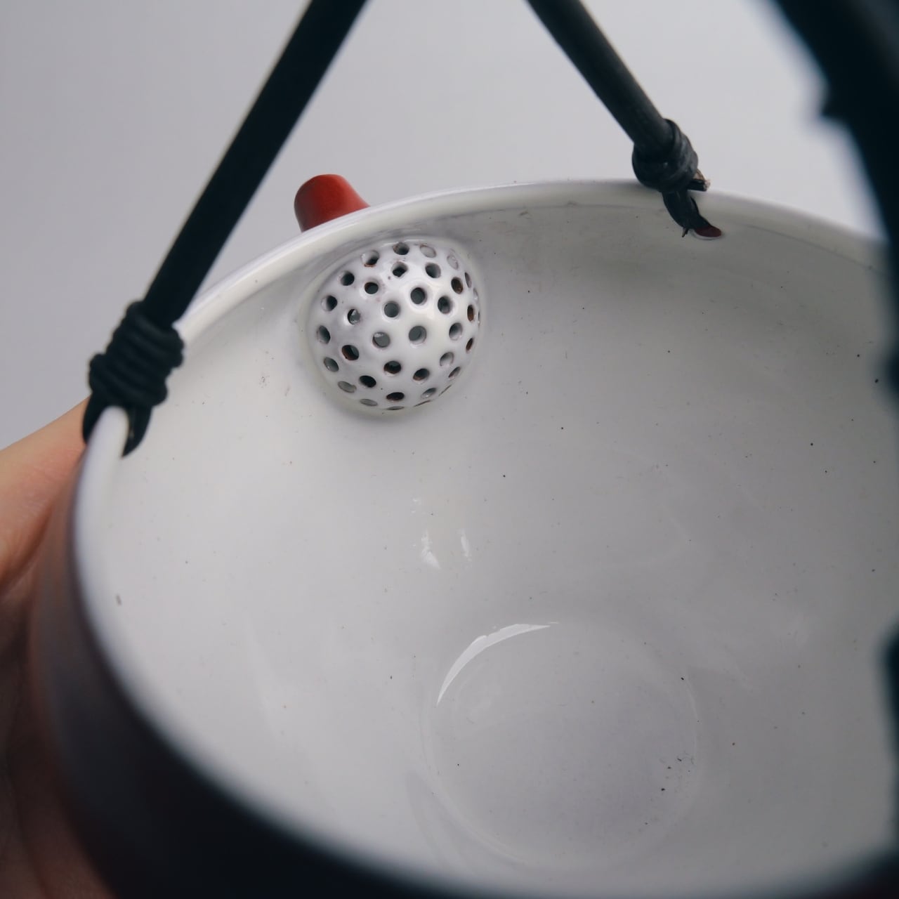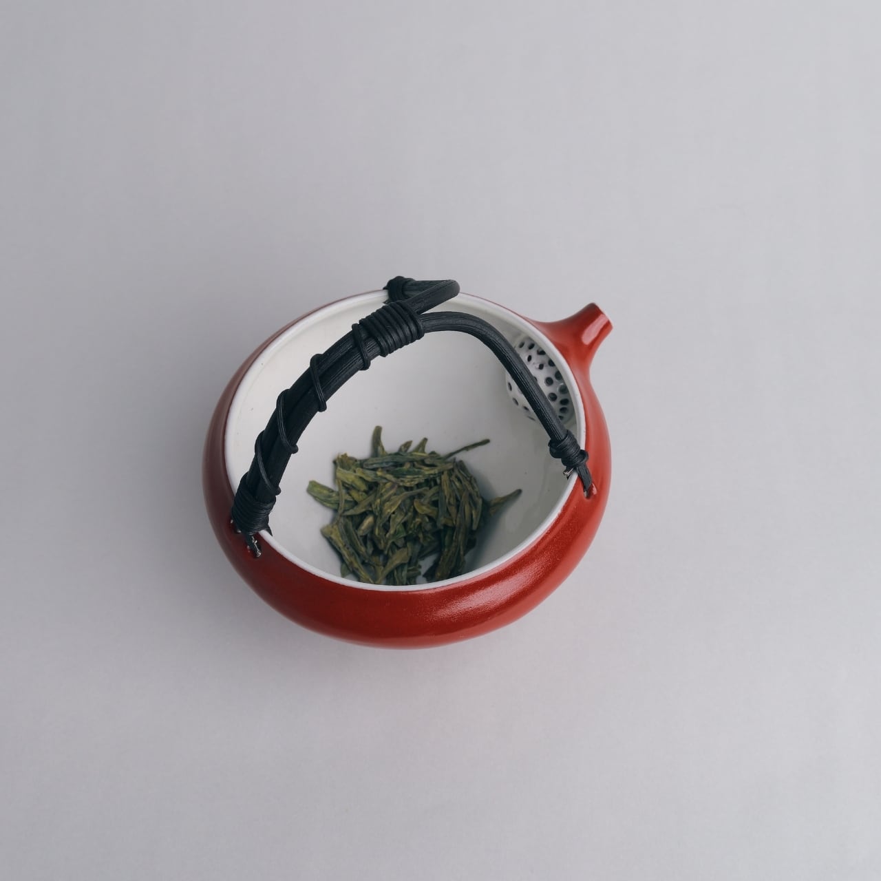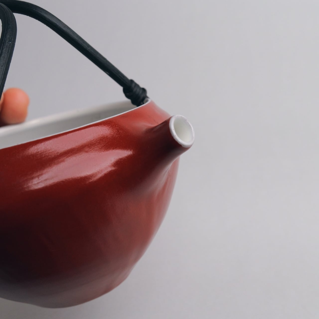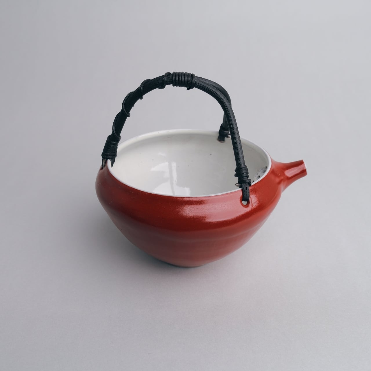 抜け感を添えてくれる茶海けん茶壷。持ち手の部分は藤を細く割き、ひとつひとつ手作業で編み上げる伝統的な技法、藤編みをあしらったとても現代的な茶器です
